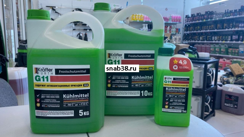 KRAFTER FURTH Антифриз G11 современная охлаждающая жидкость на базе из этиленгликоля, имеет зеленый цвет. Включает в себя силикаты и сбалансированный комплект присадок с антикоррозийными и антипенными способностями. Не имеет в составе нитритов, аминов, фосфатов. Можно отнести к стандарту G11. Если хотите надежно защитить двигатель своего автомобиля, не забудьте купить зеленый антифриз.